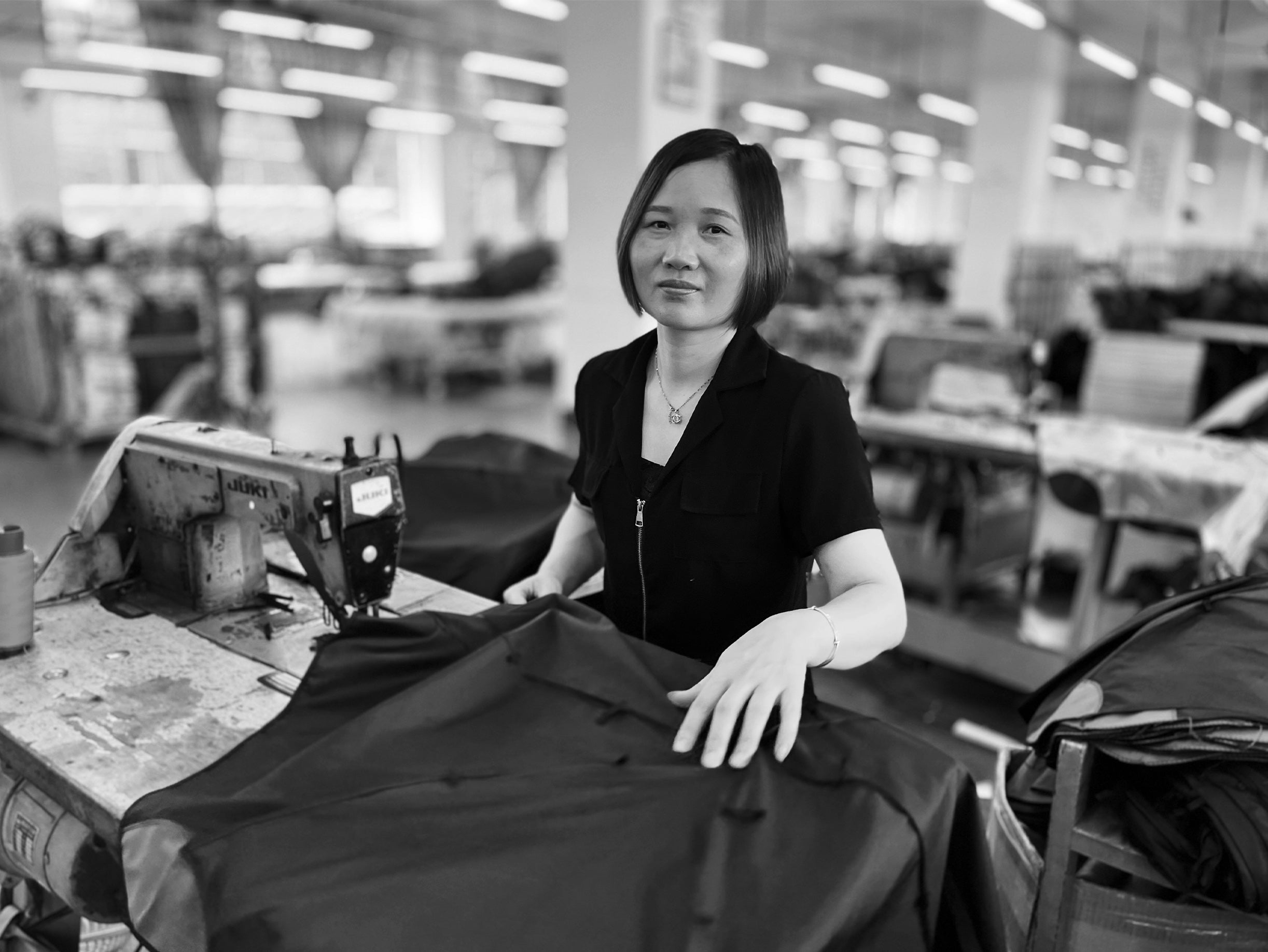 One of our talented factory seamstresses in Xiamen, Hui Lan Yang, sewing together BLUNT canopies.