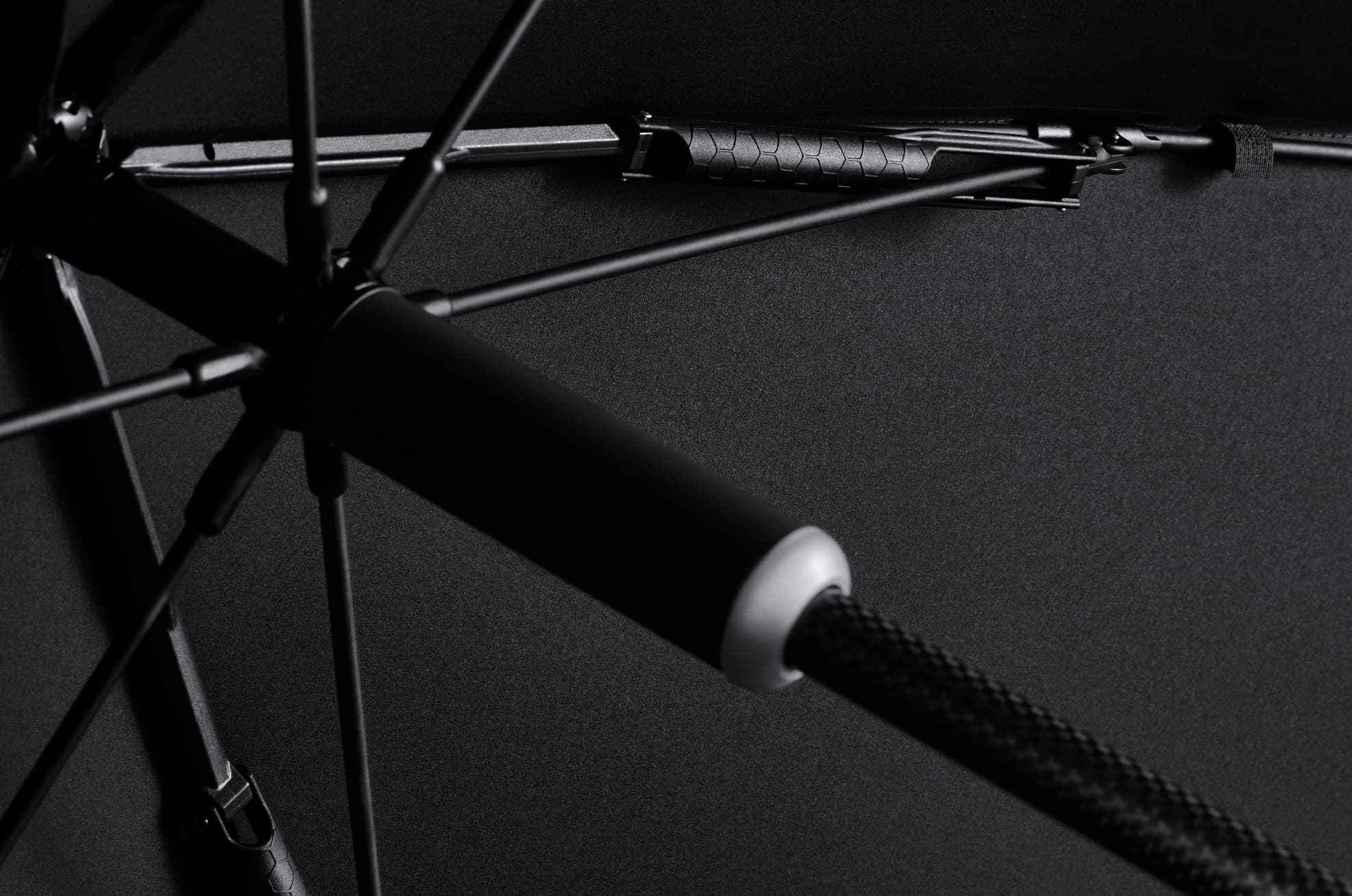 The BLUNT Umbrella frame features a unique strut mechanism that stresses the ribs, creating an effortless outward tension in the canopy as the umbrella is opened.